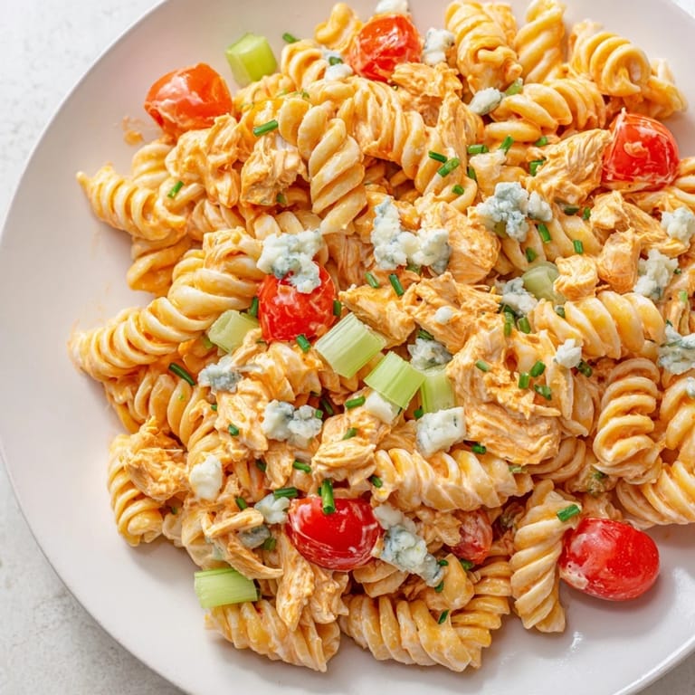 Save My neighbor showed up with this at a backyard gathering, and I watched people go back for thirds. The bowl was scraped clean before the burgers even came off the grill. She handed me the recipe on a napkin, and I've been making it ever since, tweaking it just enough to call it my own. It's one of those dishes that disappears fast and leaves everyone asking what was in it. Buffalo chicken in a cold pasta salad shouldn't work this well, but it does.
