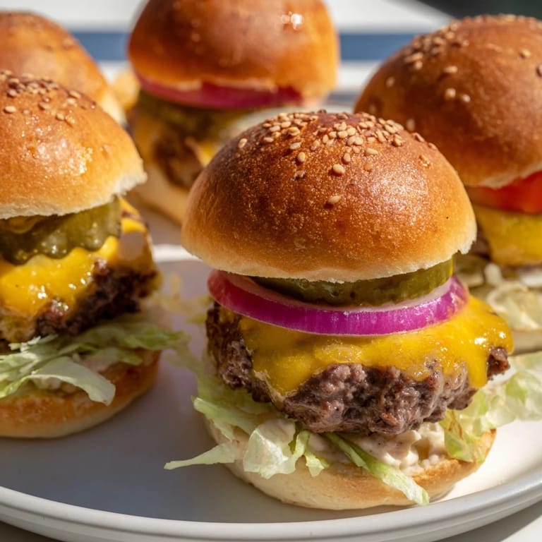 These sliders use smaller patties and mini buns, making them perfect bite-sized portions. The special sauce and assembly method create a flavor-packed experience in every bite.